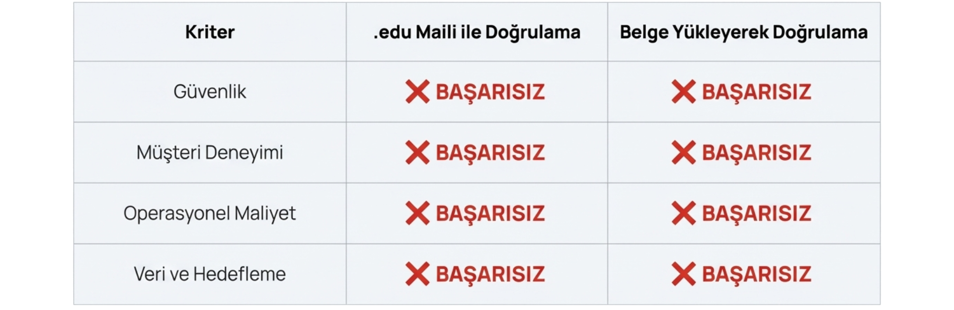 .edu mailinin zafiyetleri ortadayken, birçok marka daha güvenli olduğunu düşünerek öğrenci belgesi ile manuel doğrulamaya yöneliyor. Ancak bu yol, markaları farklı ancak bir o kadar da maliyetli bir dizi sorunla baş başa bırakıyor.Belgeyukle.png171.11 KBYüksek Sahtekarlık Riski: Dijital düzenleme araçlarıyla kolayca manipüle edilebilen belgeler, sahtekarlığa kapı açar. Örnek: Google'ın, Gemini kampanyasında milyonlarca dolar zarara uğraması ve Cursor'ın sahte belgeler yüzünden Türkiye operasyonlarını durdurması.