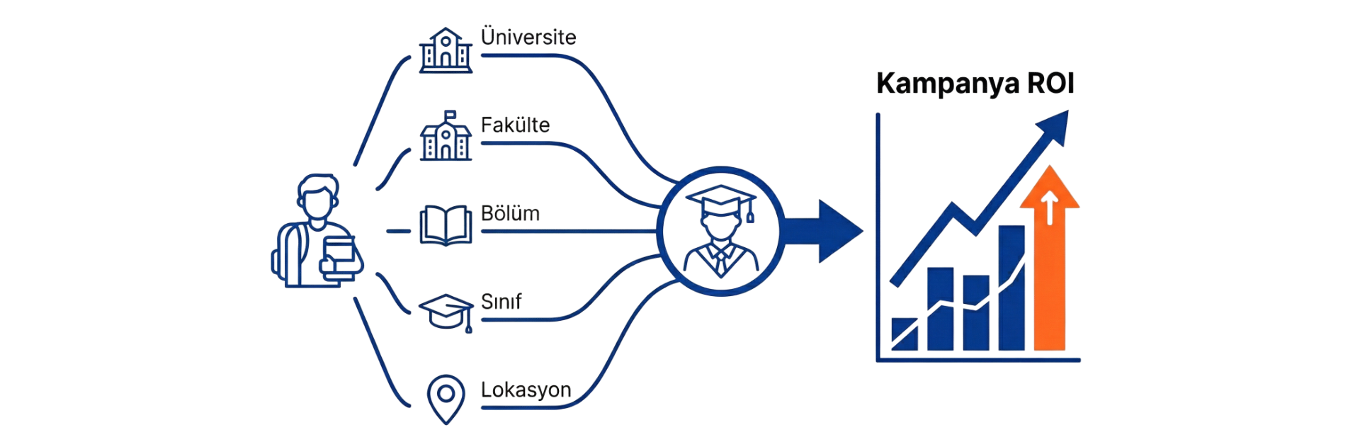 Bi'öğrenci ile birinin sadece öğrenci olup olmadığını bilmekle kalmazsınız. Üniversite, fakülte, bölüm, sınıf gibi kriterlere göre hiper-hedefli kampanyalar oluşturarak pazarlama verimliliğini en üst düzeye çıkarır ve kampanya ROI'nizi net bir şekilde ölçersiniz.